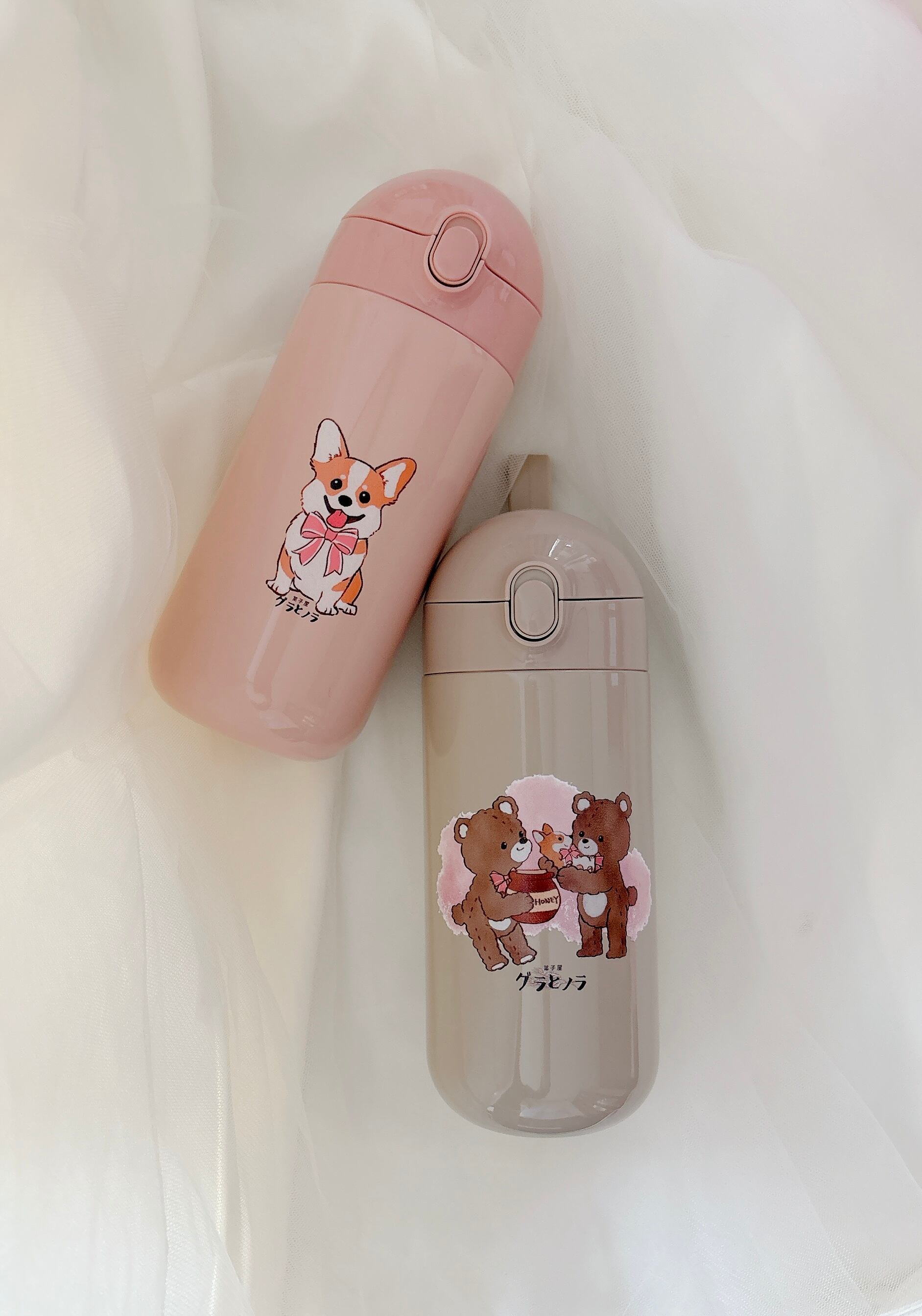 丸みのあるかわいいボトルに当店オリジナルロゴがプリントされたワンタッチサーモステンレスボトル 420ml/ベージュ・ピンク